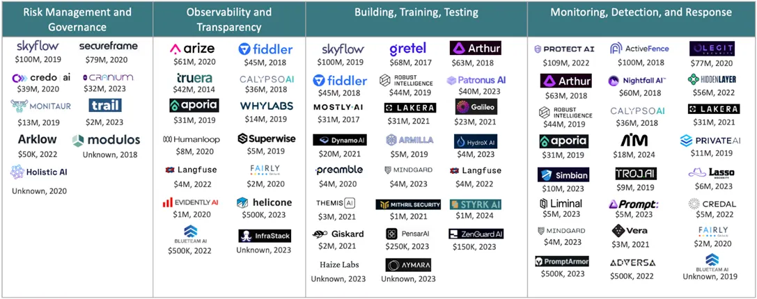 We are already seeing a massive influx of venture capital investment in the space.. Given the nascent stage of the industry, seed stage investments have been the most active. So far in 2024, there have been at least 10 early-stage companies funded: illumex, Simbian, EdgeRunner AI, TrojAI, Liminal AI, Trail, Almanax, Verax AI, FairNow, Apex.